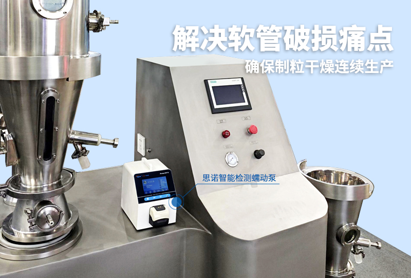 針對(duì)這一痛點(diǎn),該企業(yè)為其制粒干燥機(jī)配套選用了iPump2ZS-B+FT15智能檢測(cè)蠕動(dòng)泵。這款設(shè)備配備的漏液報(bào)警系統(tǒng)解決了難題。